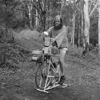 Peter Pedals demonstrates pedal-power, Websters Creek, 1993 | Energy from Nature I earned my nickname "Peter Pedals" from many years of experimentation with 'pedal power' as a renewable energy source to achieve things other than getting from A to B. This human muscle power, adapted to the task at hand with the use of a pedal machine, deserves its place amongst other renewable energy sources, such as the harnessing of sun, wind and water power. My interest in renewable energy led to several public demonstrations of these systems. Two friends joined me in 1984 to sell solar equipment at local markets from the back of a van and to help people to set up their own power systems. This led to the foundation of the now successful Rainbow Power Company in 1987. Today the company sells solar, wind and hydro-electric equipment both Australia-wide as well as throughout South-East Asia and the Pacific region, Africa and South America. The Rainbow Power Company is the largest solar powered workshop in the southern hemisphere with a 7kW solar array and 13.5kW grid interactive inverter system. We also have a wind turbine and a steam engine to help supplement the solar power and as a backup. This makes us totally self sufficient for power, with the added benefit of being able to sell our excess power to the grid and buy it back again when we need to (ie when there is insufficient sun or wind). If the grid has a blackout, the power at our premises continues regardless, operating as a large UPS (Un-interruptible Power Supply). Even though Nimbin has a town sewerage system and water reticulation system, we use a composting toilet and collect more than sufficient water for our needs from a fairly sizeable roof into two holding tanks. Reshape is a wholly owned subsidiary of Rainbow Power Company which takes care of all aspects of the business outside of Australia. Reshape can carry out feasibility studies and site assessments as well as providing training and designing village power systems, individual home power systems and UV water sterilisation plants. Renewable energy is non-polluting. It's what the planet needs. It's everywhere: we just need to tap into it. It's energy from nature. Peter van der Wik. (alias Peter Pedals), co-founder, Rainbow Power Co., Nimbin |